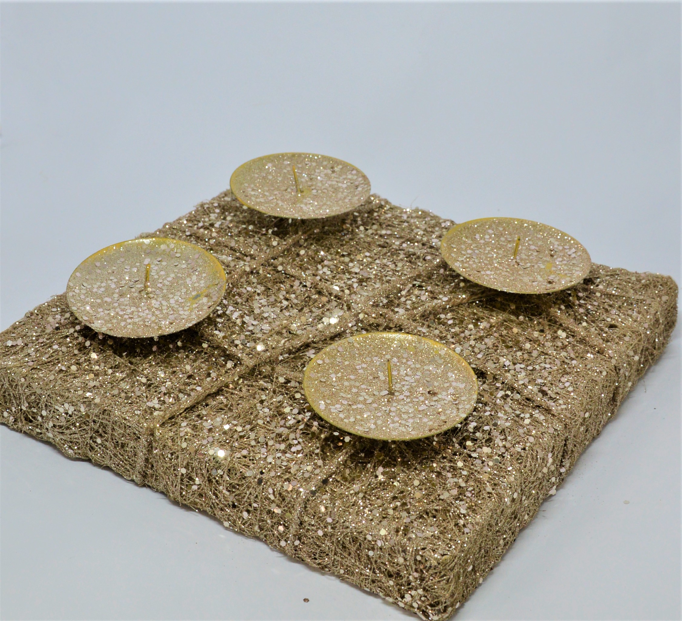 Vánoční svícen - zlatý, čtvercový adventní svícen na 4 svíčky, vyrobený z proutí.