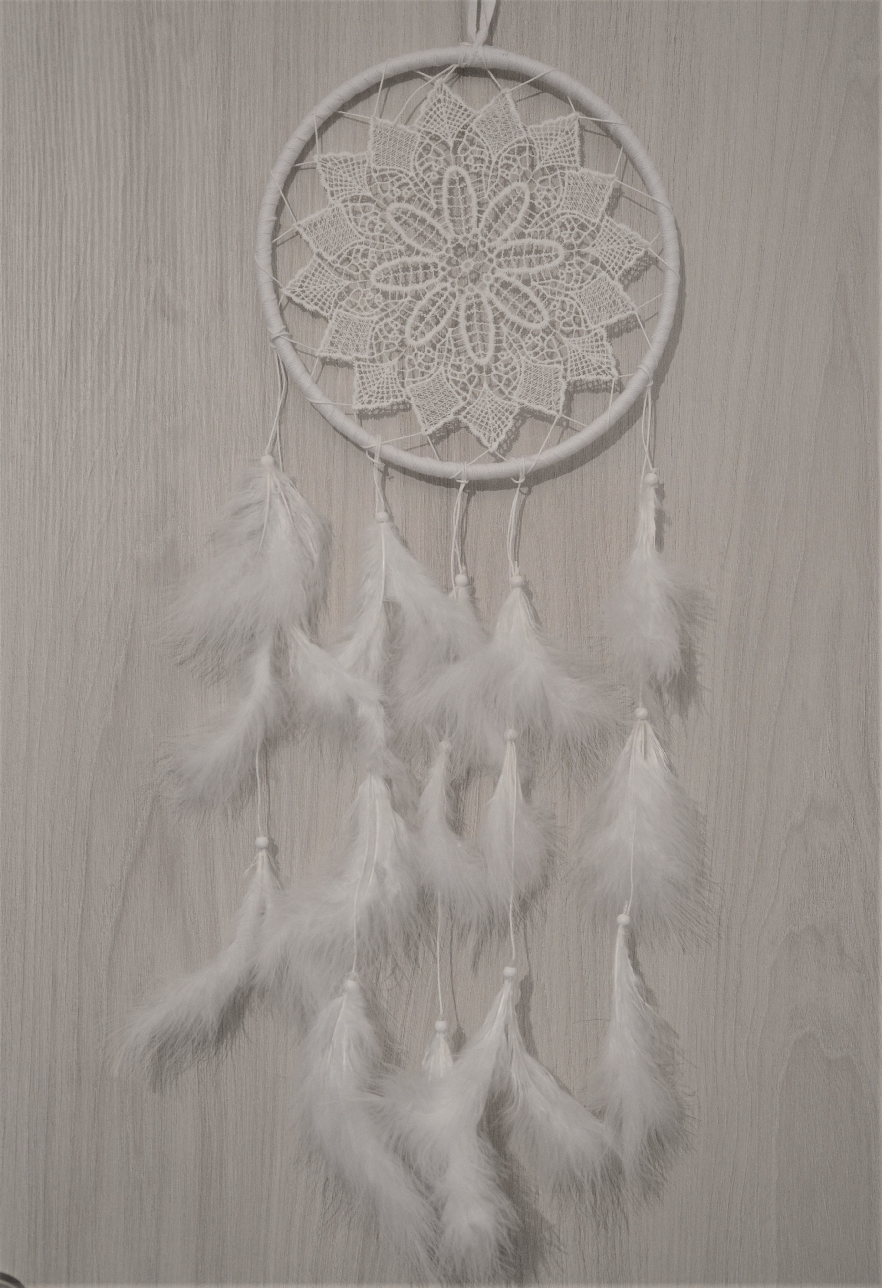 Velký lapač snů – kulatý bílý lapač snů s dlouhými peříčky.