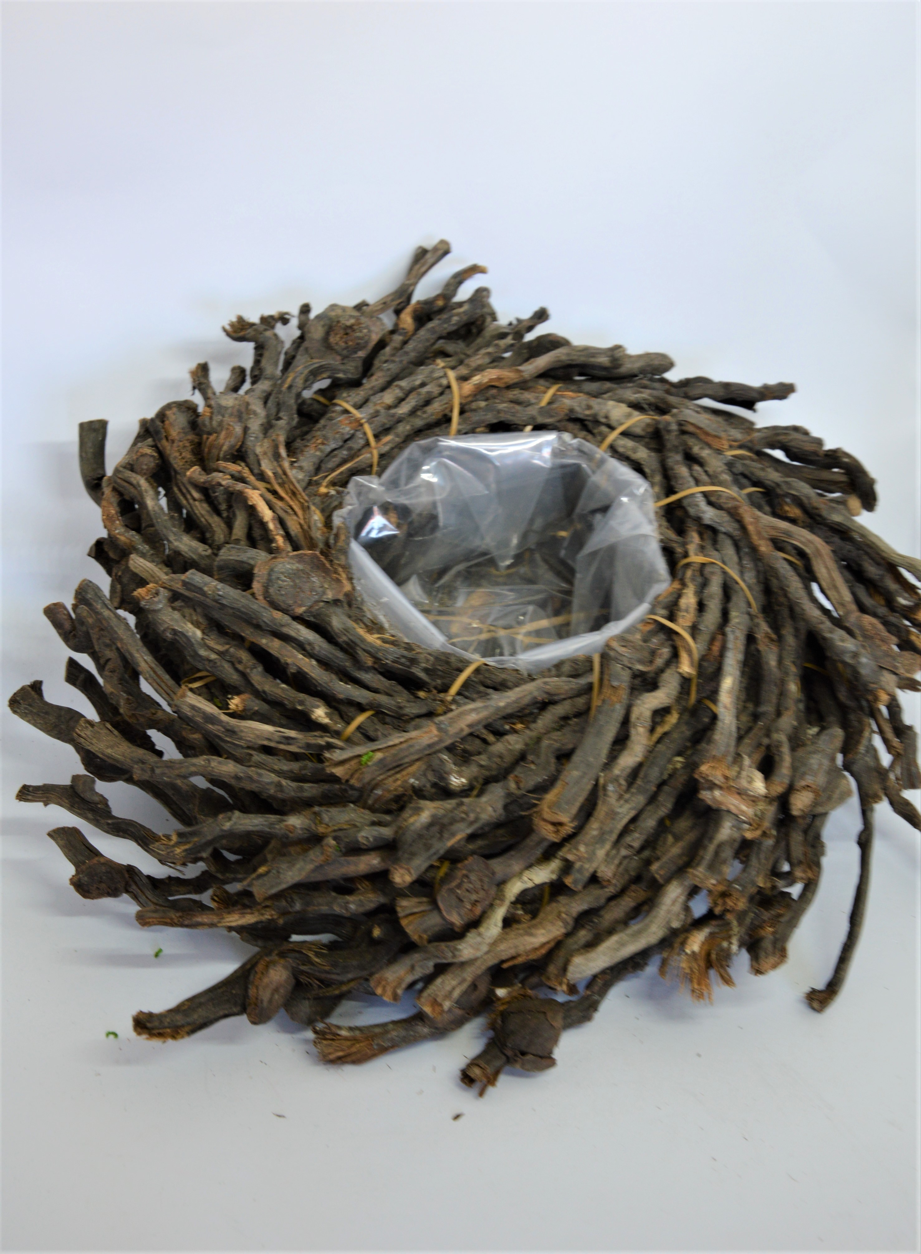 Věnec z réví – dekorační hnízdo s igelitovou vložkou uvnitř. Využít ho můžete k osázení rostlinami nebo k nejrůznějšímu aranžování.