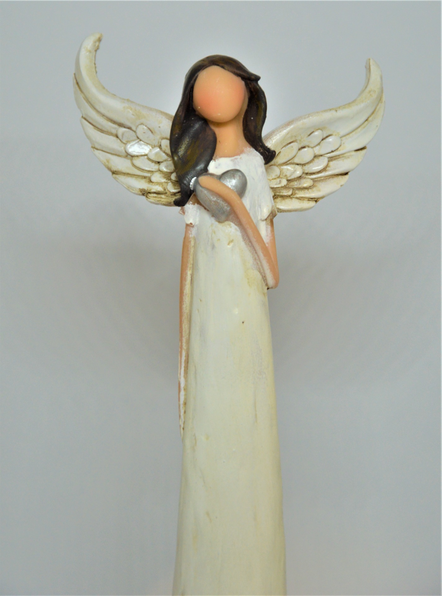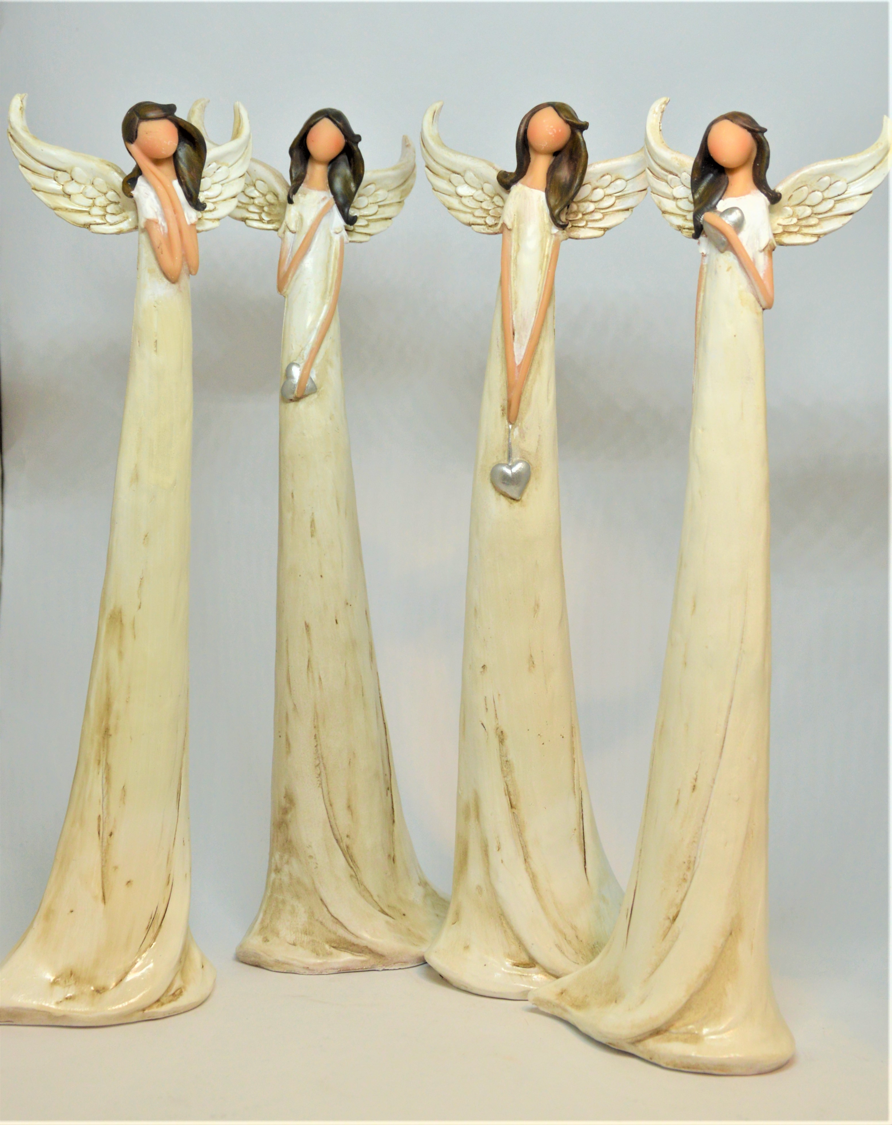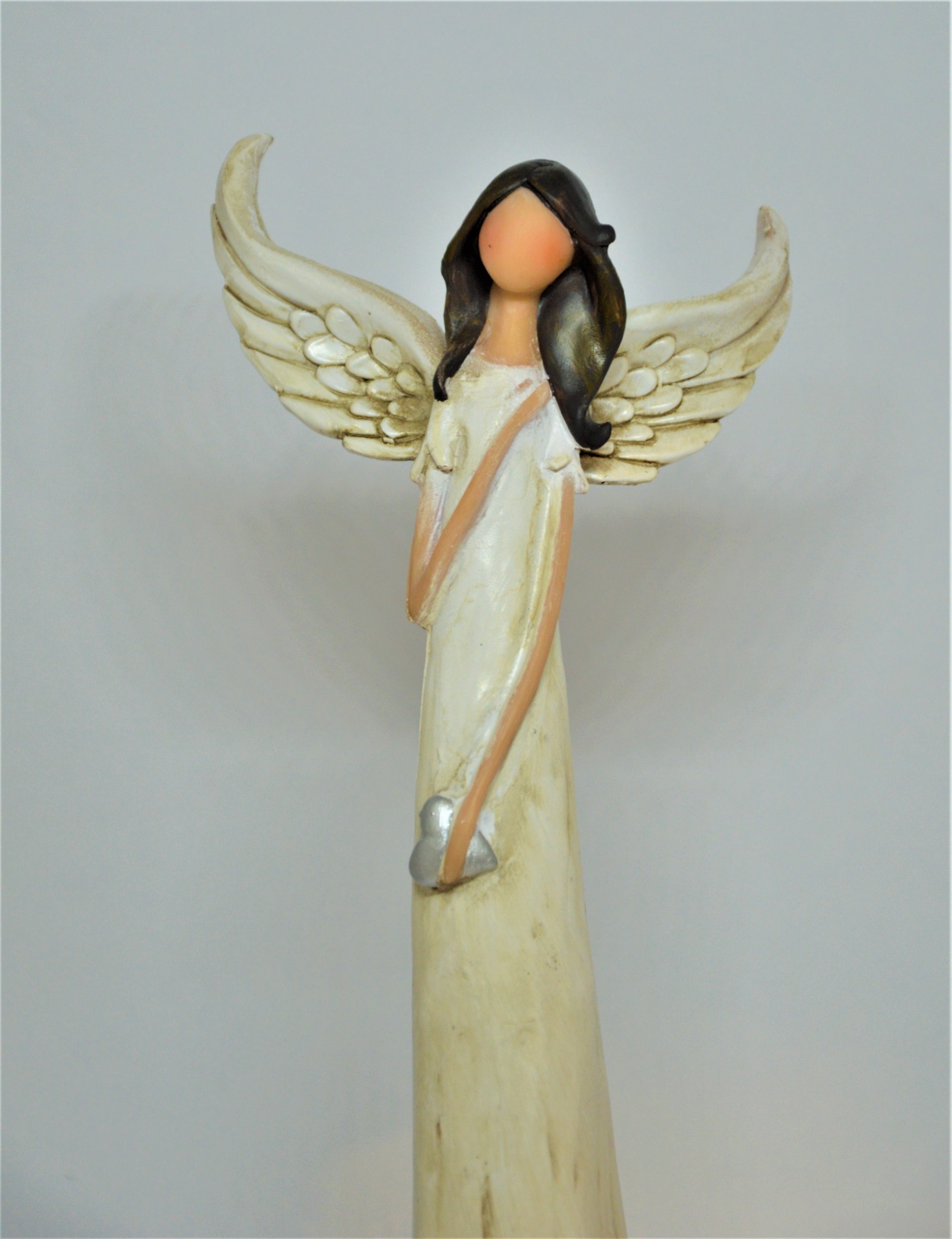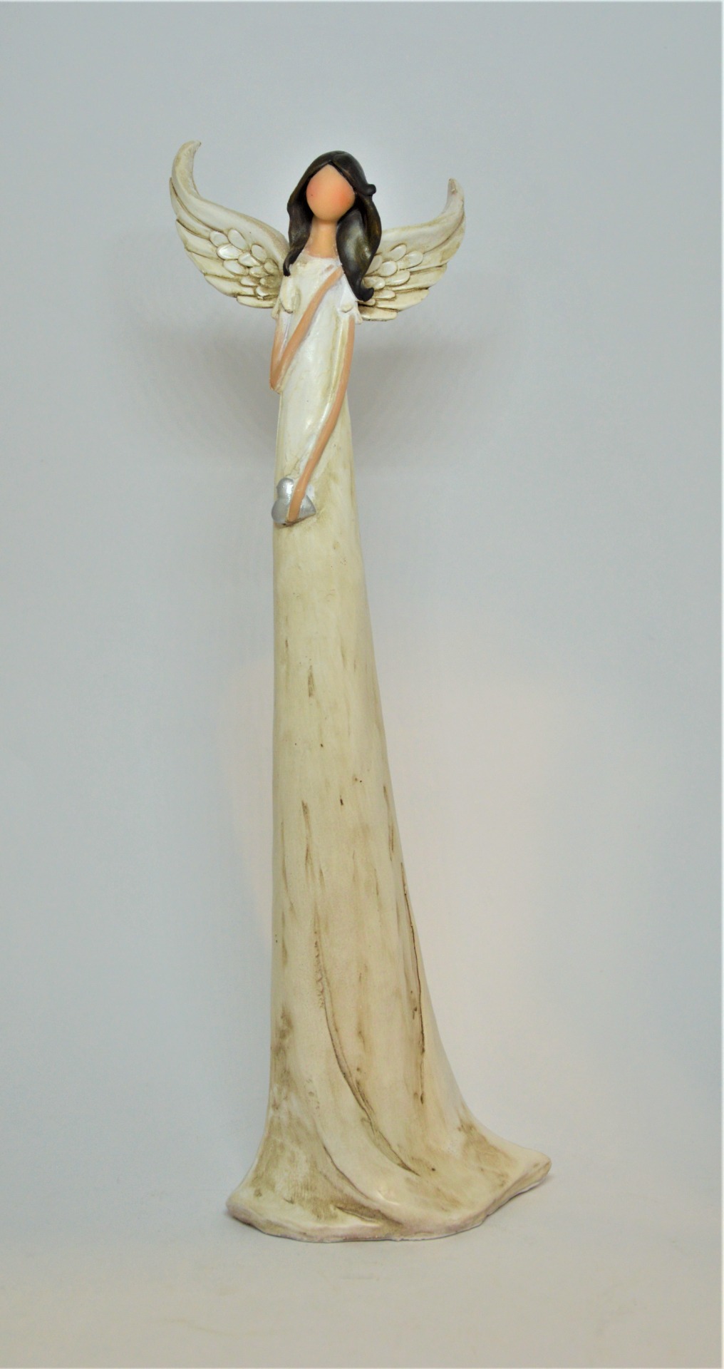 Vysoký andělíček - vysoký, štíhlý andělíček v moderním designu s nezřetelným obličejem, delšími hnědými vlasy, v bílých šatech s lehkým zabarvením a patinou.