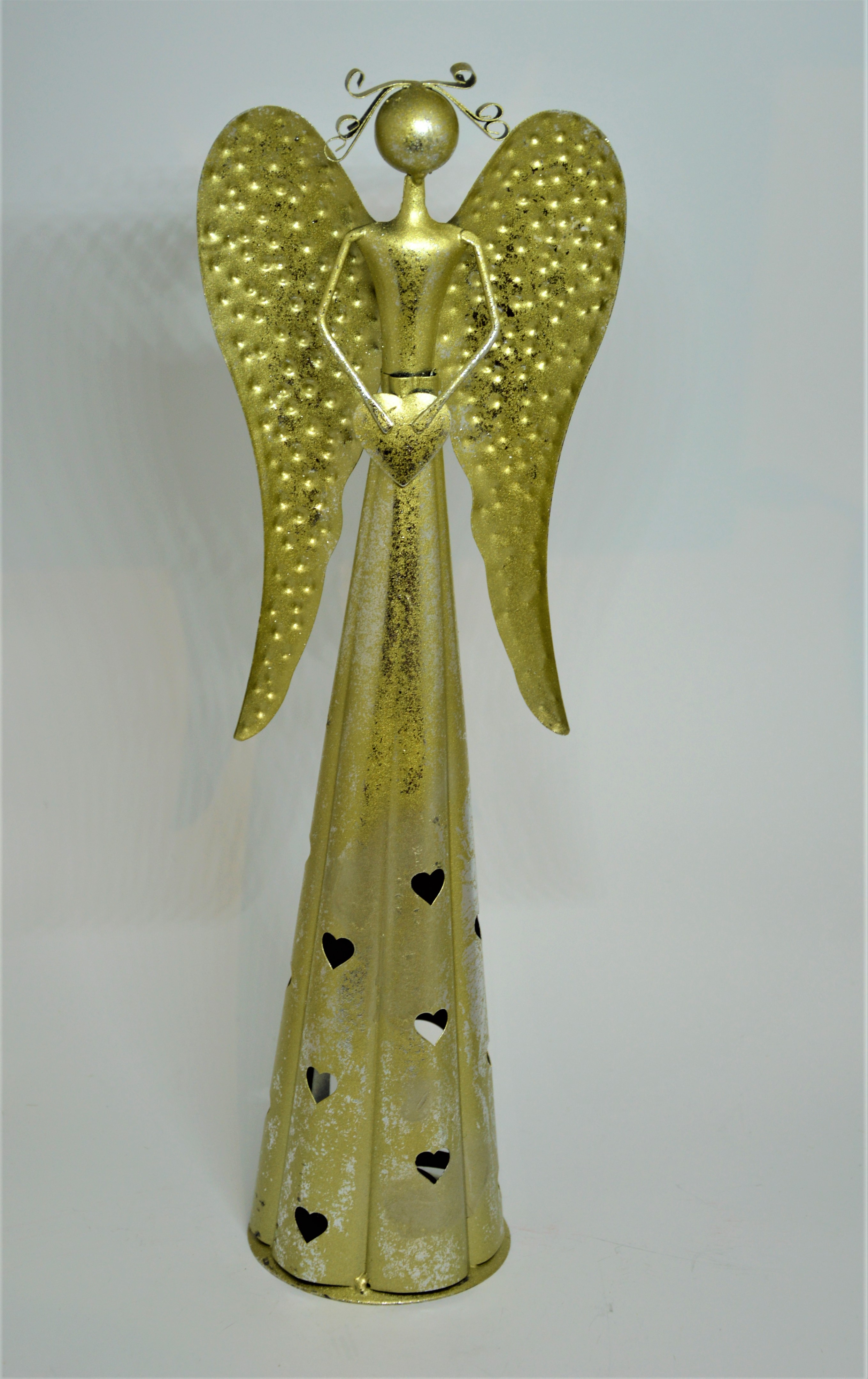 Vysoký zlatý anděl - romantický kovový anděl s výřezy srdíček na sukni a se srdíčkem v ruce udělá radost jako krásné vyznání lásky pro vaše milované.