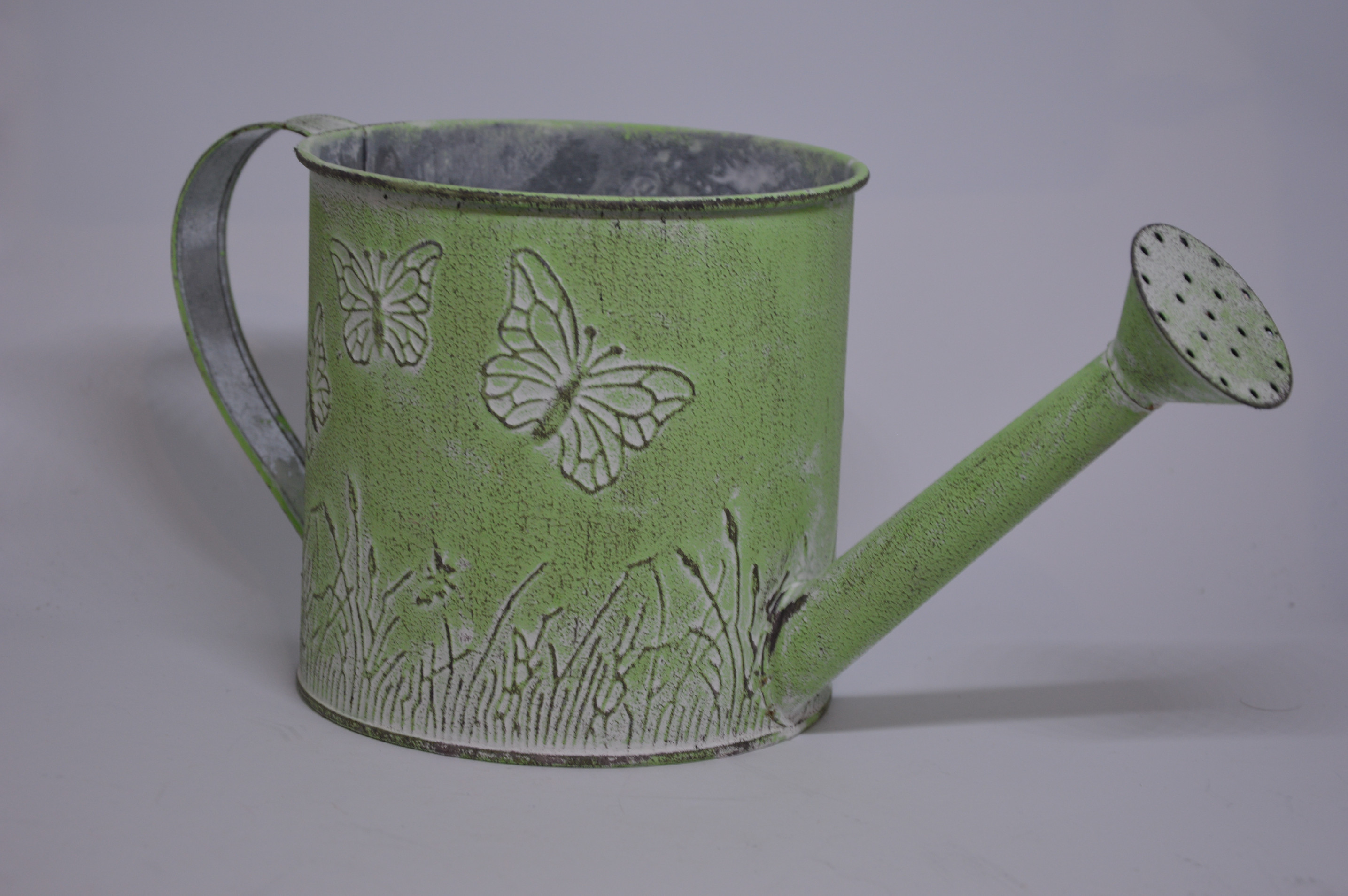 Zelená kovová konvička – konvičku, kterou lze použít jako obal na květiny, zdobí motivy motýlů a je v jemné pastelové barvě, krásně tak rozzáří každý kout.