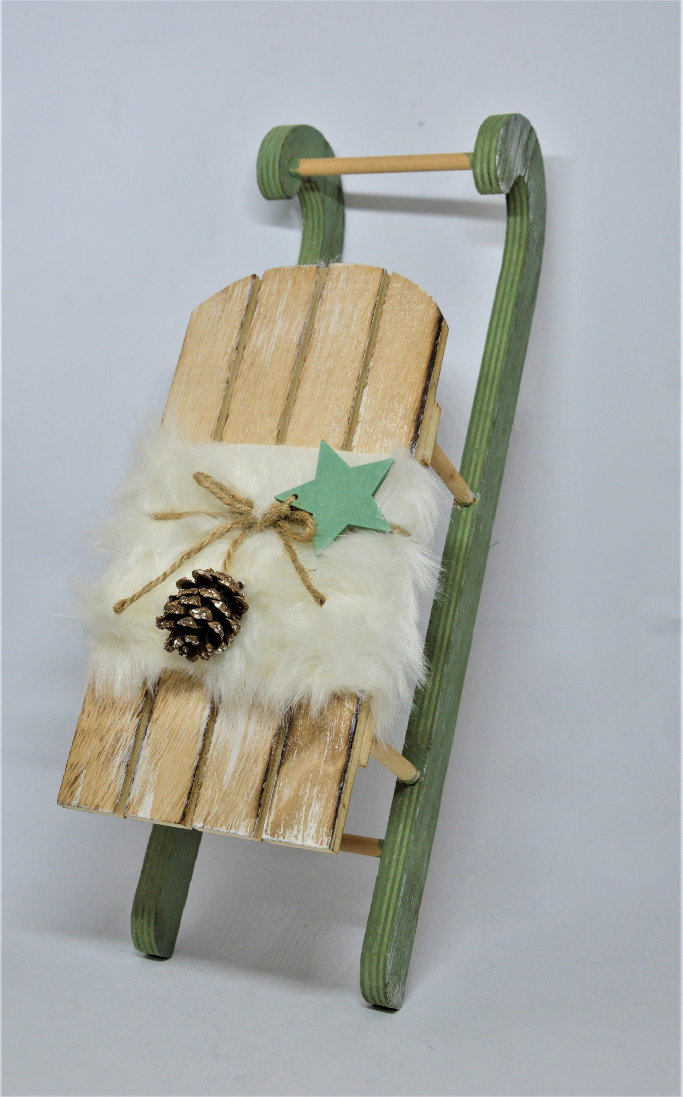 Zimní sáně - zeleno-hnědé dekorativní dřevěné sáňky s bílým lemem z umělé kožešiny, s hvězdičkou, šiškou a převázané jutovým provázkem vypadají, jako by dorazily rovnou z chladného severu.