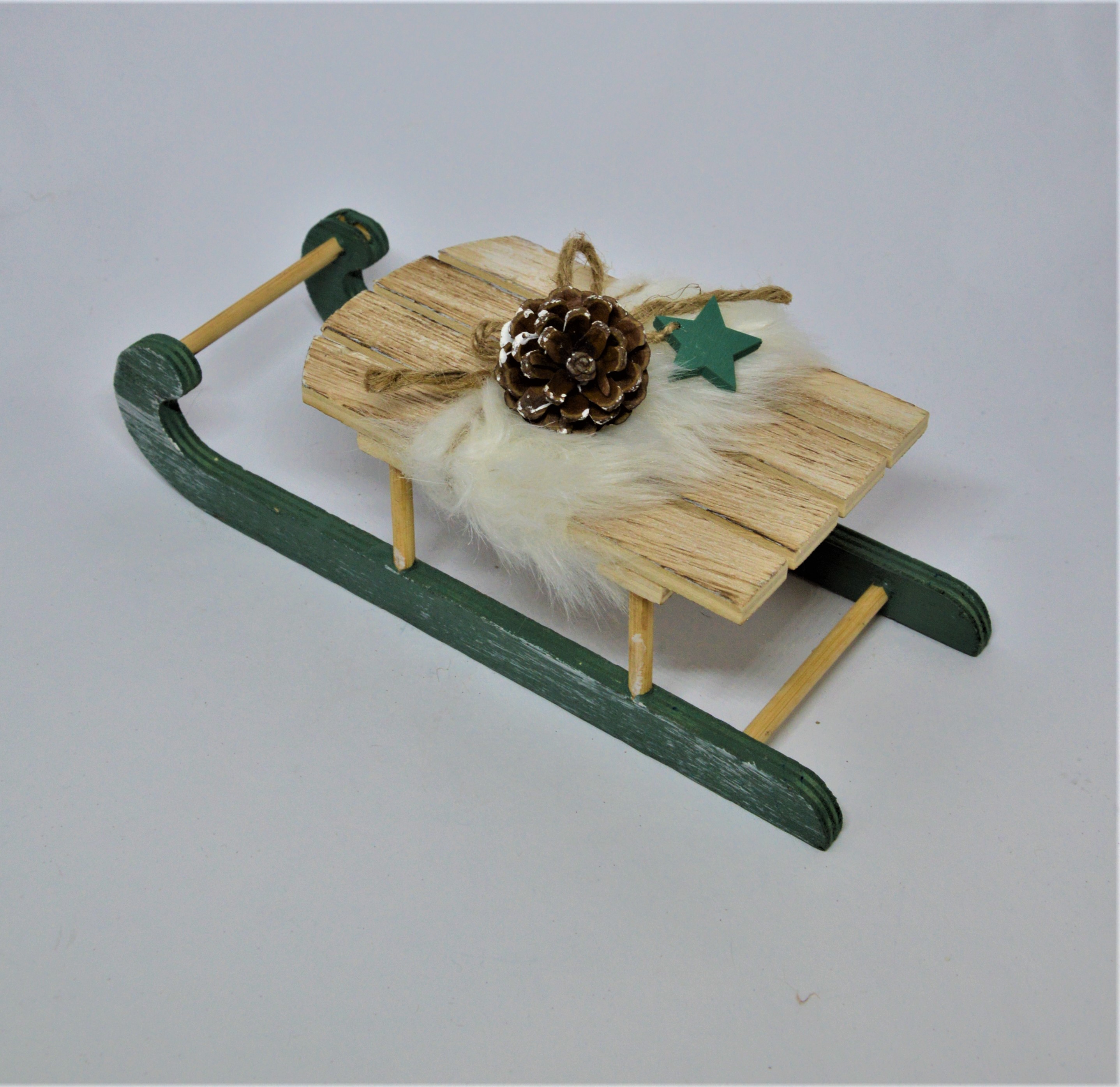Zimní sáňky - zeleno-hnědé dekorativní dřevěné sáňky s bílou umělou kožešinou, zdobené hvězdičkou a šiškou a převázané jutovým provázkem.