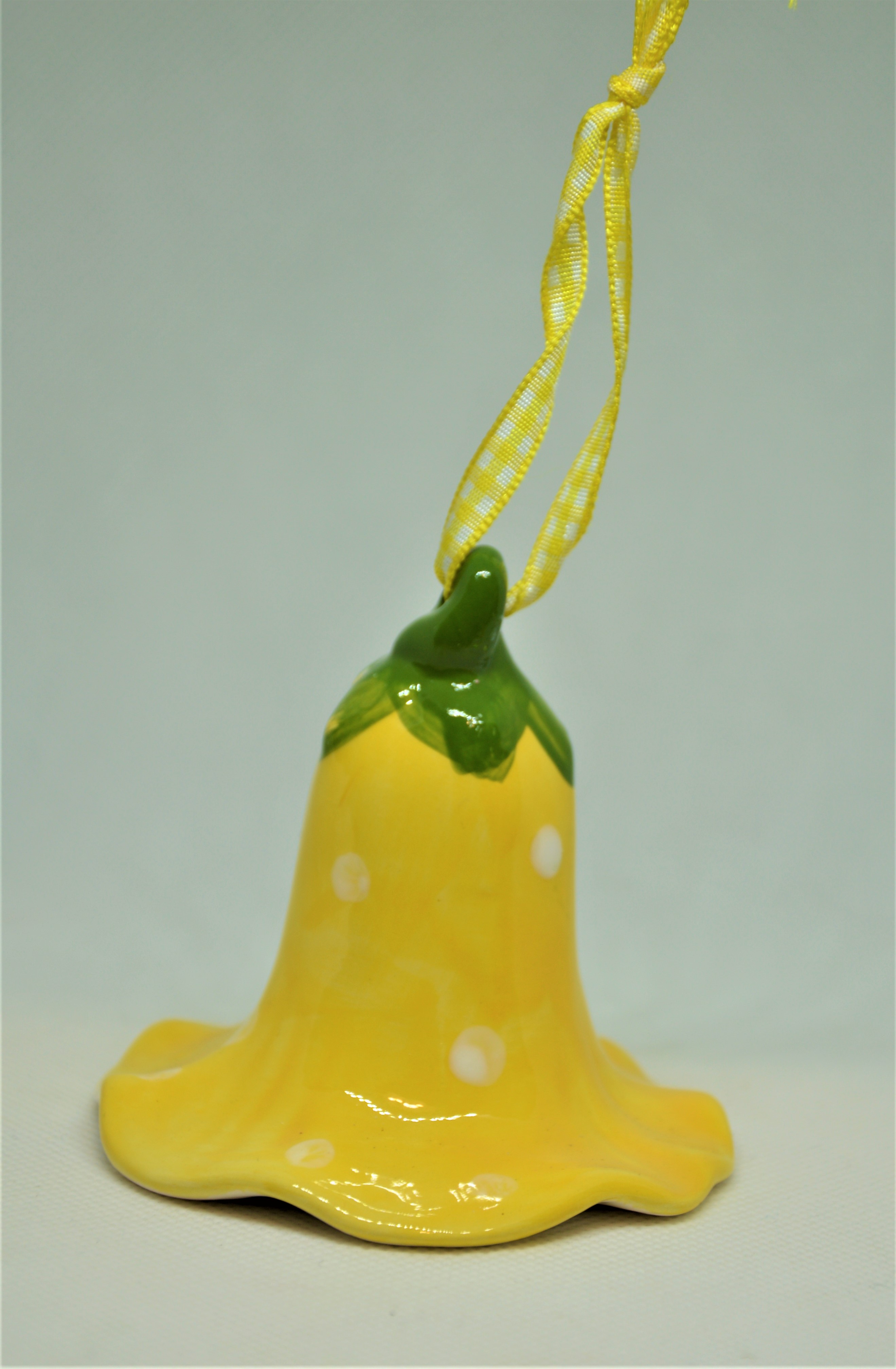 Zvoneček ve tvaru žlutého květu - jemný keramický zvoneček ve tvaru žlutého květu vykouzlí ve vašem interiéru jarní atmosféru. Vyvedený je ve veselé žluté barvě, zdobí ho bílé puntíky.
